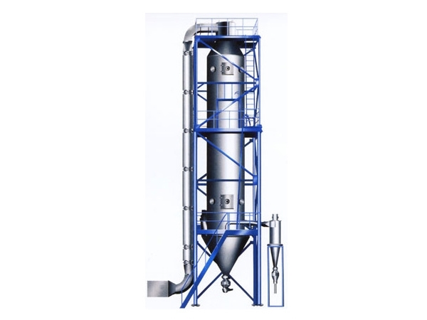 The working process of the unit is that the feed fluid is ejected by high pressure through the diaphragm pump to eject atomized droplets. The hot air then flows down, and most of the particles are collected at the bottom of the tower. The exhaust gas and its tiny powder are separated by a cyclone separator, and the exhaust gas is exhausted by an exhaust fan. The powder is collected by a pollination cylinder arranged at the lower end of the cyclone separator, and the fan outlet can also be equipped with a two stage dust removing device with a recovery rate of more than 96-98%.