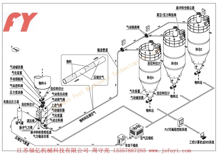 3). Dense phase conveying system: At present, the most advanced pneumatic conveying technology is to transport materials at high pressure and low speed at a high solid gas ratio. The utility model has the advantages that the abrasion of the pipeline is low, and the energy consumption is saved.