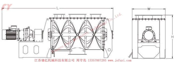 攪拌器軸,外螺旋帶在動力的驅(qū)動下,其盤繞形式配合旋轉(zhuǎn)方向把物料從U型倉兩端向中央地帶推動,而內(nèi)螺旋帶把物料從中間向兩端推動,形成對流混合?;旌蠙C臥式筒體底部中央開設(shè)出料口,外層螺旋帶的蝸旋結(jié)構(gòu)配合主軸旋轉(zhuǎn)方向驅(qū)趕筒壁內(nèi)側(cè)物料至中央出料口出料,確保筒體內(nèi)物料出料無死角。