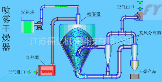 空氣經(jīng)過(guò)濾和加熱,進(jìn)入干燥器頂部空氣分配器,熱空氣呈螺旋狀均勻地進(jìn)入干燥室。料液經(jīng)塔體頂部的高速離心霧化器,(旋轉(zhuǎn))噴霧成極細(xì)微的霧狀液珠,與熱空氣并流接觸在極短的時(shí)間內(nèi)可干燥為成品。成品連續(xù)地由干燥塔底部和旋風(fēng)分離器中輸出,廢氣由風(fēng)機(jī)排空。